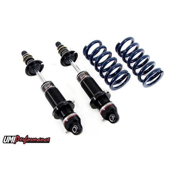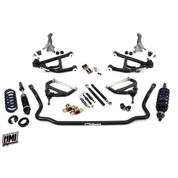 UMI’s Corner Max front end kits are a comprehensive system with our best corner carving parts under one easy to find part number. The Corner Max system combines geometry corrected a-arms with a combination of tall spindles and ball joints, higher rate springs, UMI rebound adjustable monotube shocks, heavy duty sway bar and a bump steer kit. The addition of tall 2” drop spindles with taller ball joints greatly improves camber gain and allows for a low center of gravity. The foundation of the kit includes our coilover-only lower a-arms featuring caster improvement, quality ball joints, and the ability to remove the spring and shock without taking the spindle apart. The upper a-arm features rod ends for smooth operation and the ability to adjust without shims. The 1-5/16” sway bar upgrade complete with UMI’s fabricated end links reduces body roll and helps speed transitions. Racing coilover springs are paired with UMI’s rebound adjustable coilover monotube shocks. Fine tuning is accomplished with a UMI bump steer kit. The Corner Max kit is built to make the stock GM clip work as well as it possibly can with a true bolt-on kit. All UMI Performance parts are fabricated and raced with pride out of Philipsburg, PA – USA. Race proven on the UMI LeMans.
