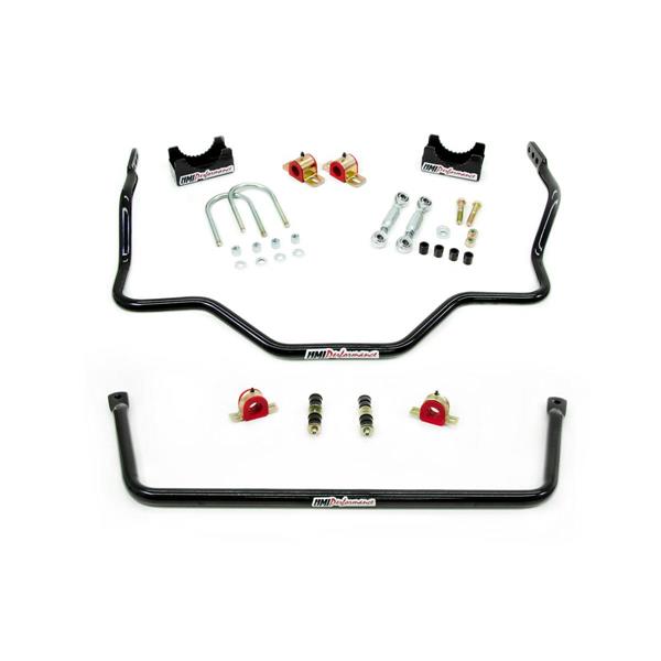 Heavy duty front and rear sway bar kit dramatically reduces body roll and improves cornering performance. Front tubular bar balances increased stiffness while saving weight. Solid 1″ rear Pro-Tour style bar features three stiffness settings. Kit includes bushings, endlinks and all hardware required for installation. 100% Made In USA.