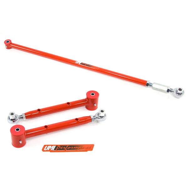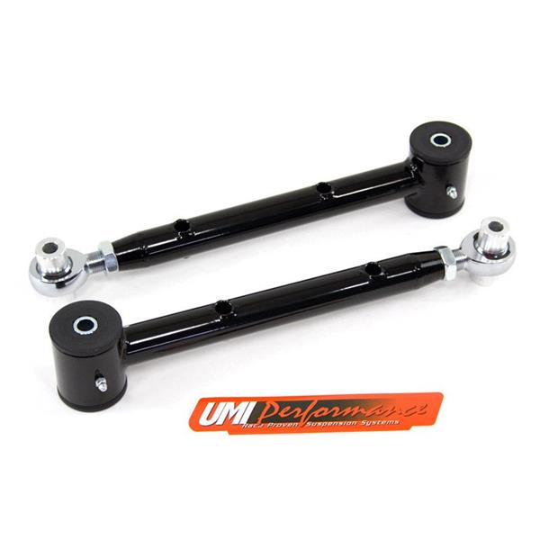 UMI"s lower control arms are a direct bolt-on replacement designed to minimize wheel hop and improve traction while helping track consistency. These control arms are constructed of drawn over mandrel mild steel tubing measuring 1.250" OD x 0.120" wall thickness, CNC machined and fully TIG welded. The spherical rod endallows for a bind free operation, making a great upgrade for both a track and auto cross driven car. The polyurethane bushings are designed to be bolted to the car chassis for a quiet comfortable operation while the rod ends attach to the rear end. Control arms feature Energy Suspension polyurethane bushings; zinc plated steel sleeves and on-car grease-able grease fittings. Adjustments can be made using the high quality Teflon lined spherical rod end thatallows the rear end to be moved forward or backward, this is excellent when running larger tires and aftermarket rear end installs that require rear end centering.