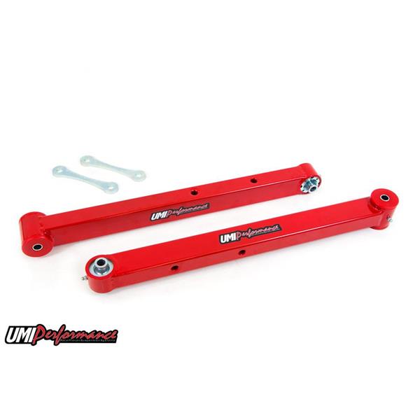 UMI's boxed lower control arms utilize our Roto-Joint technology for a bind free performance and quiet comfortable ride quality. The boxed control arms are fabricated from 0.120” wall thickness rectangular tubing, CNC machined drawn over mandrel bushing holders and MIG welded end caps to keep out unwanted road debris. Each control arm features the correct provisions for adding a stock or aftermarket rear sway bar, sway bar holes are reinforced with a 0.120” wall thickness steel sleeve that is TIG welded and sanded into place. The solid construction combined with the delrin lined Roto-Joints eliminate control arm flex and bushing deflection for improved traction and reduced wheel hop. The installed Roto-Joint is a pivot ball lined with a greaseable delrin race designed to offer 28 degrees of total unrestricted movement, more than adequate for a bind free, low friction operation. The Roto-Joint design improves performance over the factory rubber and aftermarket polyurethane bushings by allowing the suspension to articulate correctly, and provide precision handling. The installed UMI Roto-Joint allows rear end free movement when high handling, auto cross or road race is a concern while still being a 100% streetable setup. The installed delrin race, which lines the spherical ball, absorbs shock and road noise for a quiet and smooth operation on any street or track driven vehicle. This control arm set features polyurethane bushings on one end and UMI’s swivel Roto-Joint on the other end. This set-up is designed for street performance and street enthusiast. The polyurethane bushing end is designed to be bolted to the vehicle chassis side while the Roto-Joint attaches to the rear end side. Since the polyurethane bushings are softer they are designed to absorb more road noise and shock before it enters the passenger compartment of the vehicle.