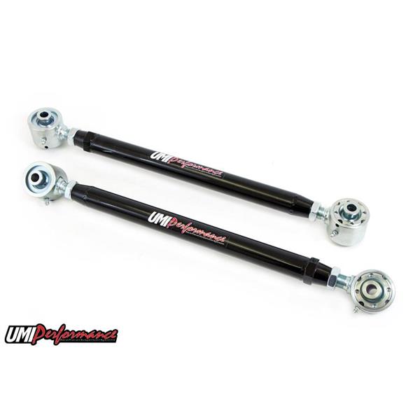 UMI's double adjustable lower control arms utilize our Roto-Joint technology for a bind free performance, quiet ride quality, and also offer on car adjustment. The control arms can be adjusted longer or shorter moving the rear end back or forward to squeeze those larger tires in the fender wells. Adjustable control arms are also recommended for most aftermarket rear end installs to center the rear end and prevent tire rubbing. The installed Roto-Joint is a pivot ball lined with a greaseable delrin race designed to offer 28 degrees of total unrestricted movement, more than adequate for a bind free, low friction operation. The Roto-Joint design improves performance over the factory rubber and aftermarket polyurethane bushings by allowing the suspension to articulate correctly, and provide precision handling. The installed UMI Roto-Joint allows rear end free movement when high handling, auto cross or road race is a concern while still being a 100% streetable setup. The installed delrin race, which lines the spherical ball, absorbs shock and road noise for a quiet and smooth operation but also works excellent as a solid bushing drag race control arm. The control arms are fabricated from 1-1/4” drawn over mandrel tubing with TIG welded chromoly threaded tube adapters for the utmost in strength and performance. The threaded ends feature left and right hand threads for easy on car adjustments, simply loosen the jam nuts and turn the wrench to make adjustments. This control arm set features Roto-Joints on both sides of the control arms. This is designed for maximum performance and suspension travel. All Roto-Joints are greaseable and low maintenance making an excellent street setup for your cruiser or race car!