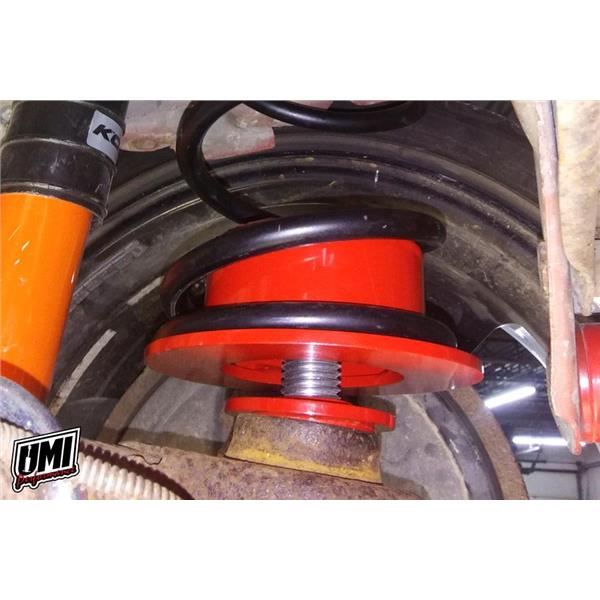 UMI's rear weight jacks provide ride height adjustment and excellent handling for your 3rd or 4th Gen GM F-Body. The kit includes custom wound premium race quality springs and our own unique spring perches featuring a smooth acting Torrington bearing. The heavy duty jack screw and spring pad is easily adjusted by using a 3/4" socket, extension and ratchet through the bottom of the existing hole in the axle. Installation requires simply removing the standard spring and inserting the weight jack assembly. Minor grinding required on left axle pad instructions included. 100% Made In USA.
