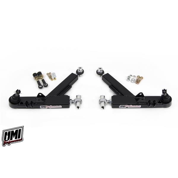 UMI’s heavy duty boxed lower a-arms P/N 2314 with dual rod ends provides a rock-solid foundation for your autocross, road race or corner carving 4th Gen. The a-arms fully gusseted box tubing construction combines strength with a five pound weight savings per set over factory lower a-arms. Shock mounting is double shear with a ½” dia x 1-¼” width racing coilover mount – suitable for most racing coilover systems. Revised ball joint location adds a nominal 2 degrees caster increase. These arms have double shear sway bar mount tabs with endlink set included. P/N 2314 is designed to work with the factory K-member, UMI k-members, and virtually all aftermarket K-members. Crafted with pride in Philipsburg, PA- USA.