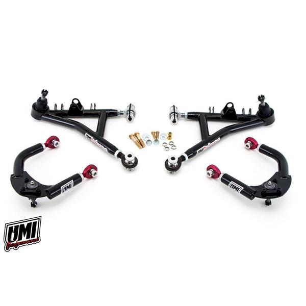 UMI’s drag specific a-arms for 1993-2002 GM F-Body use every trick we know to shave weight, reduce friction and still provide plenty of strength. On the upper arms, our industry leading high clearance geometry tucks into the wheel well just like stock to afford maximum suspension travel when dropping from a wheel stand. Strong CrMo tube construction and a streamlined ball joint plate combined with high strength aluminum racing rod ends save one half pound per side over the stamped stock arms. The lowers feature CrMo construction and our newly redesigned tube configuration ensures performance and safety whether you’re landing a wheel stand or powering through the traps at 160+. They accept most major brands of racing coilovers with the ½” x 1-¼” wide mount. There are provisions for a travel limiting chain and also an optional sway bar tab for light street use. These arms save 5-1/2lbs per side, come assembled with premium ball joints, race quality rod ends and are ready to bolt on.
