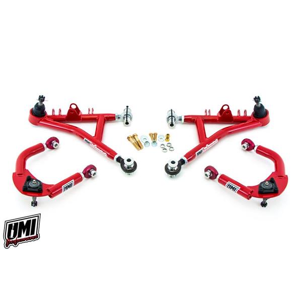 UMI’s drag specific a-arms for 1993-2002 GM F-Body use every trick we know to shave weight, reduce friction and still provide plenty of strength. On the upper arms, our industry leading high clearance geometry tucks into the wheel well just like stock to afford maximum suspension travel when dropping from a wheel stand. Strong CrMo tube construction and a streamlined ball joint plate combined with high strength aluminum racing rod ends save one half pound per side over the stamped stock arms. The lowers feature CrMo construction and our newly redesigned tube configuration ensures performance and safety whether you’re landing a wheel stand or powering through the traps at 160+. They accept most major brands of racing coilovers with the ½” x 1-¼” wide mount. There are provisions for a travel limiting chain and also an optional sway bar tab for light street use. These arms save 5-1/2lbs per side, come assembled with premium ball joints, race quality rod ends and are ready to bolt on.