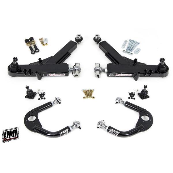 UMI’s heavy duty boxed arm kit with adjustable rod ends provides a rock-solid foundation for your autocross, road race or corner carving 4th Gen. The lower a-arms fully gusseted box tubing construction, while appearing heavy-duty, affords a five pound weight savings per set over factory lower a-arms. These arms have double shear sway bar mount tabs with endlink set included as well as factory GM pedestal location. Lower arms are compatible with factory, Koni, and other t-bar, stock mount shocks. Upper arms feature caster and camber adjustment with premium rod ends. Laser cut ball joint pads feature improved ball joint angle and increased caster (up to additional 2 degrees - varies by chassis) for lowered cars and come assembled with premium ball joints. UMI’s newest design features the most travel and clearance of any a-arm on the market and is a must for lowered vehicles. This A-arm kit is designed to work with the factory K-member, UMI k-members, and virtually all stock mounting point aftermarket K-members. Crafted with pride in Philipsburg, PA- USA.
