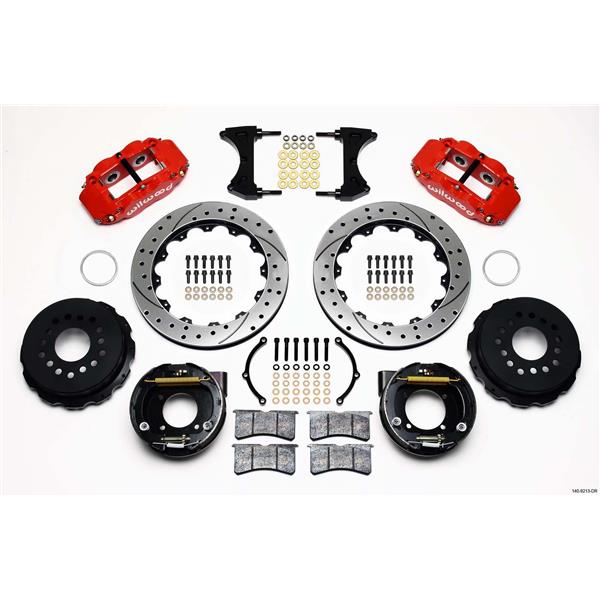 Forged Narrow Superlite 4R rear disc kits provide the ultimate Big Brake solution for popular muscle car rear axles that require a parking brake. FNSL4R four piston calipers, 12.88 two-piece rotors, and high performance BP-10 compound pads provide optimized and balanced braking to compliment front big brake upgrades on all types of custom, show and high performance street machines. The neatly hidden internal shoe system provides a clean installation with superior static holding power for parking. Optional caliper finishes and rotor designs allow builders to personalize the style and performance for every application.