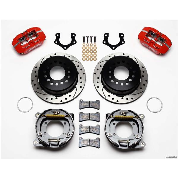 Forged Dynapro Low-Profile Pro-Series rear disc brake kits provide a complete solution for popular muscle car rear axles on applications that require a parking brake assembly and extra clearance for 14.00 to 15.00 wheel applications. Forged billet Dynapro Low-Profile four-piston calipers 11.00 one-piece hat and rotor assemblies, and high friction pads provide optimized and balanced braking for all types of custom performance street/strip and show machines. The neatly hidden internal shoe system provides a clean installation with superior static holding power for parking. Optional caliper finishes and rotor designs enable the builder to personalize the style and optimize brake performance for every individual application