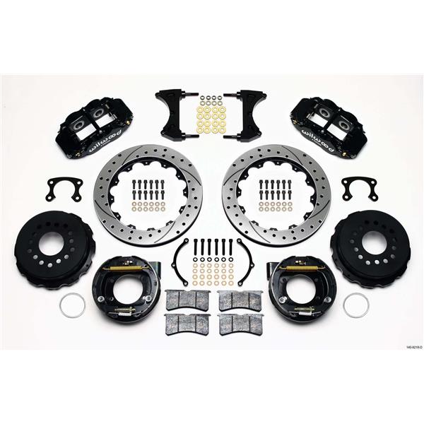 Forged Narrow Superlite 4R rear disc kits provide the ultimate Big Brake solution for popular muscle car rear axles that require a parking brake. FNSL4R four piston calipers, 12.88 two-piece rotors, and high performance BP-10 compound pads provide optimized and balanced braking to compliment front big brake upgrades on all types of custom, show and high performance street machines. The neatly hidden internal shoe system provides a clean installation with superior static holding power for parking. Optional caliper finishes and rotor designs allow builders to personalize the style and performance for every application.