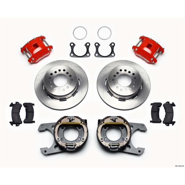 D154 Pro-Series rear disc kits provides a complete solution for popular muscle car rear axles that require a parking brake. Forged D154 dual piston calipers, 12.19 one-piece drum/rotors, and high friction pads provide optimized and balanced braking for all types of custom performance street/strip and show machines. The neatly hidden internal shoe system provides a clean installation with superior static holding power for parking. D154 rear caliper kits offer a complimentary match to vehicles using Wilwood D52 or D154 calipers on OE spindles. Optional caliper finishes and rotor designs enable the builder to personalize the style and optimize brake performance.